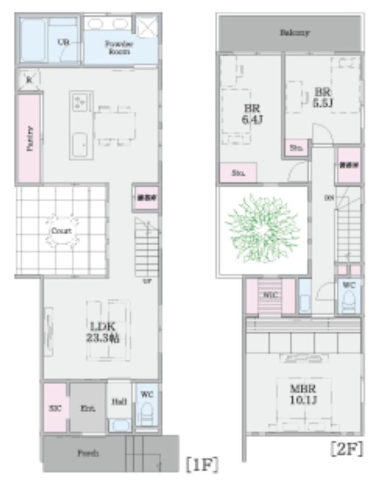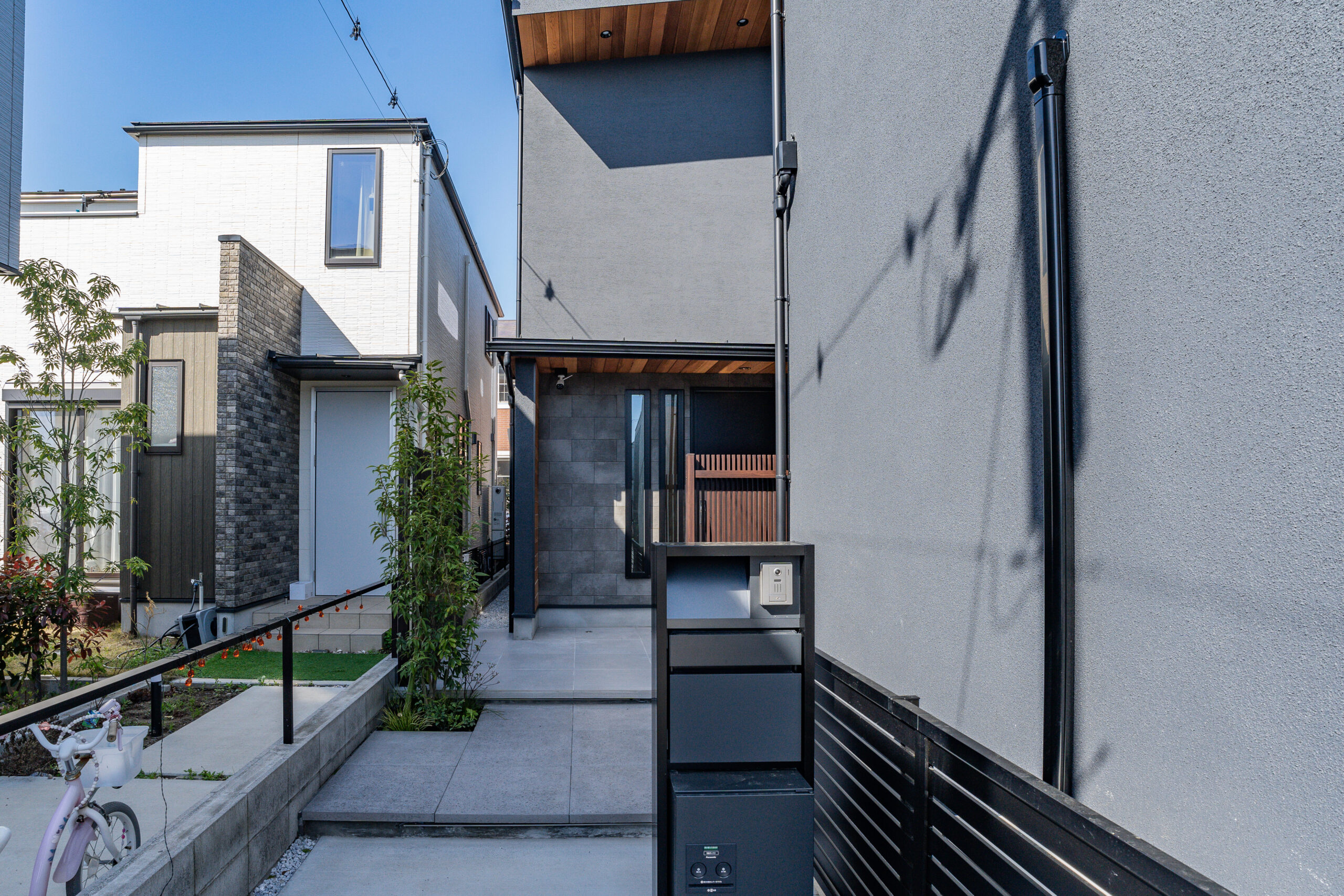 本鵠沼B号棟では、旗竿地の地形を活かして、素敵なアプローチを造りました。