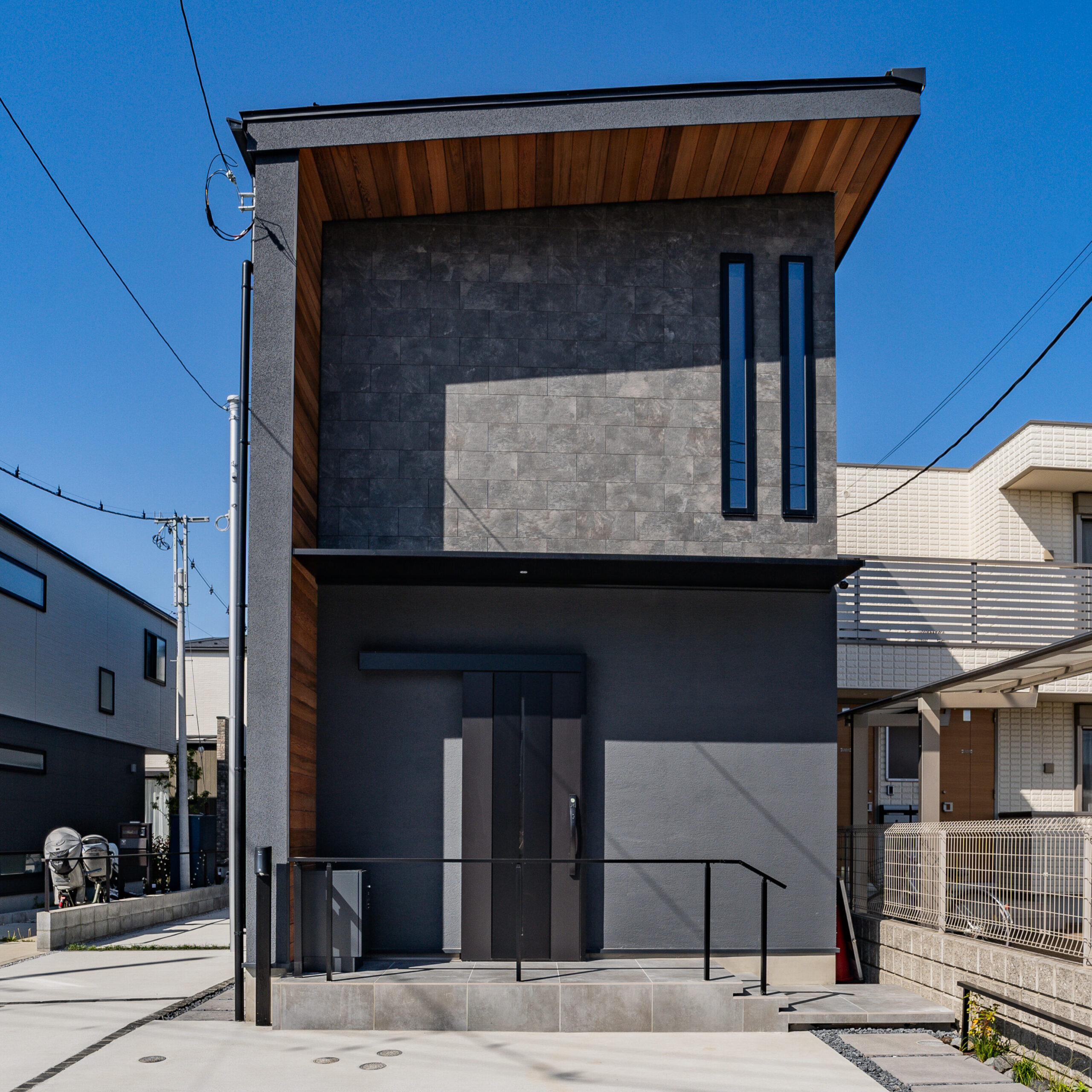 シンプルなダークトーンの外壁を、軒天の木製パネルが飾り、
