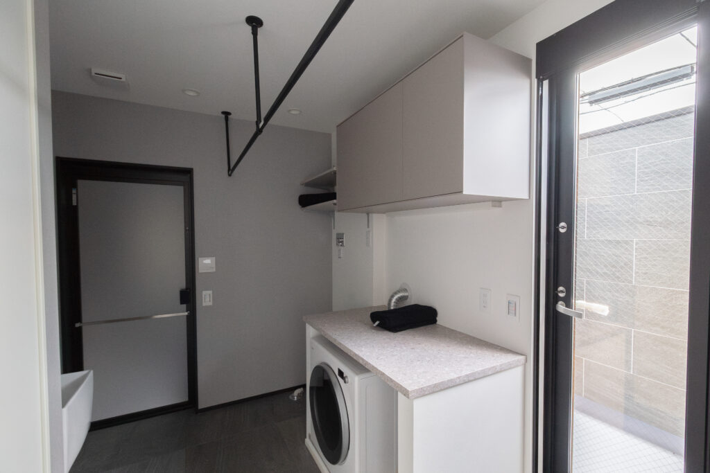 洗濯機のあるランドリールームから、干すスペース、収納まで、すべてが数歩の距離に配置されています。また、シンクもついており汚れを落としてすぐに洗濯機へ、導線が短いので時短が叶います。